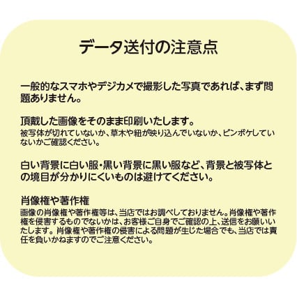 画像の肖像権や著作権等は、当店ではお調べしておりません。肖像権や著作権を侵害するものでないかは、お客様ご自身でご確認の上、送信をお願いいたします。 肖像権や著作権の侵害による問題が生じた場合でも、当店では責任を負いかねますのでご注意ください。